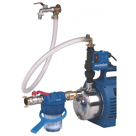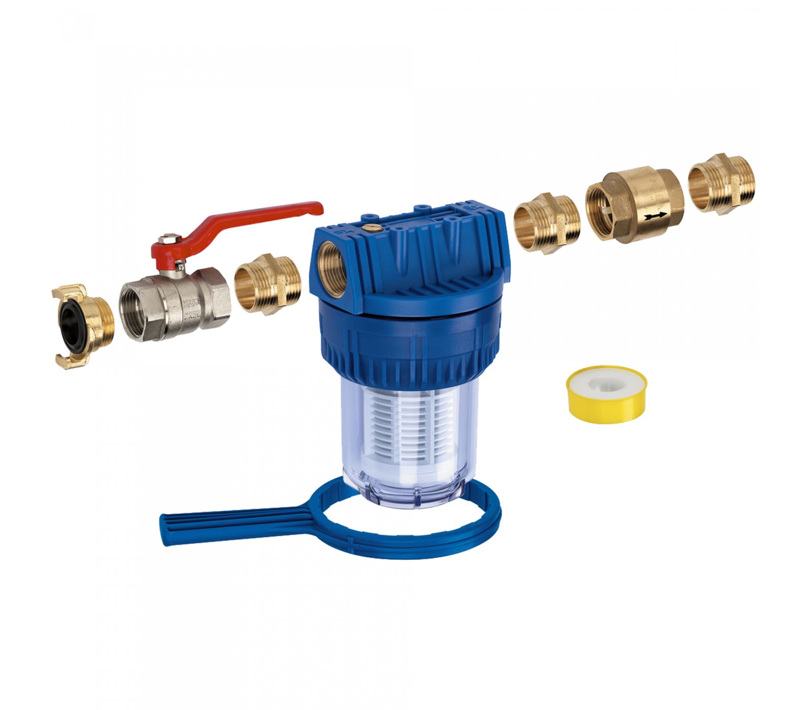 - Filtr do pomp ogrodowych; 1 gwint wewnętrzny; Zmywalny wkład filtra; Złączka mosiężna; Zawór zwrotny z mosiądzu; Szybkozłączka z mosiądzu;