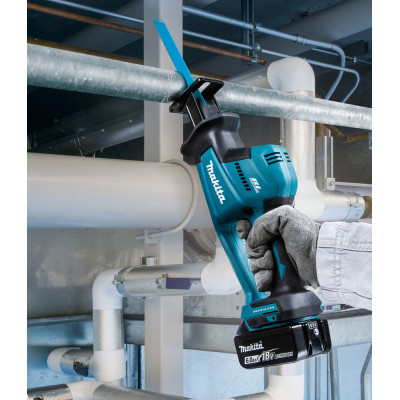 Makita DJR189Z 18V to mocna i lekka (2,2–2,5 kg) pilarka szablastowa. Silnik bezszczotkowy osiąga 3100 skoków/min i 22 mm skoku, zapewniając szybkie i precyzyjne cięcie. Tnie drewno (do 255 mm) i rury stalowe (do 130 mm). Technologia XPT chroni przed kurzem i wilgocią. Wyposażona w LED i system ochrony akumulatora dla dłuższej pracy. Idealna na budowę i do remontów – np. do cięcia belek czy demontażu starych rur.
