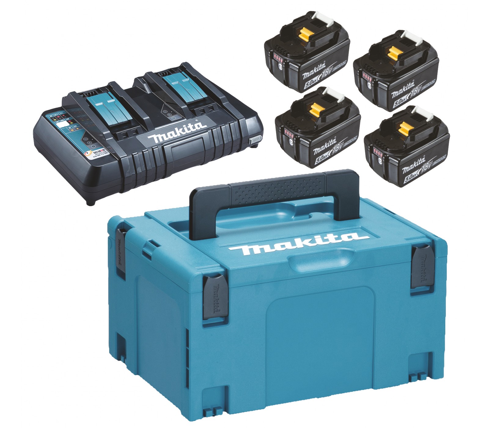 - 4 x BL1850B (197280-8), 1 x DC18RD (196933-6), 1 x Makpac nr. 3 (821551-8)