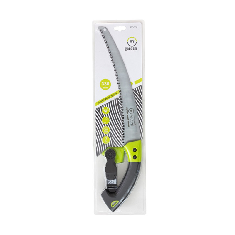 Zakrzywiona piła ogrodowa z walizką. Ząb piły o rozmiarze 7TPI, ostrzony pod potrójnym kątem (japoński). Wygodny gumowany uchwyt. Długość ostrza roboczego wynosi 330 mm, hartowane zęby zwiększają trwałość narzędzia. Etui przeznaczone jest do przenoszenia narzędzia i mocowania go do paska. Zakrzywiony kształt ułatwia pracę na wysokości.
